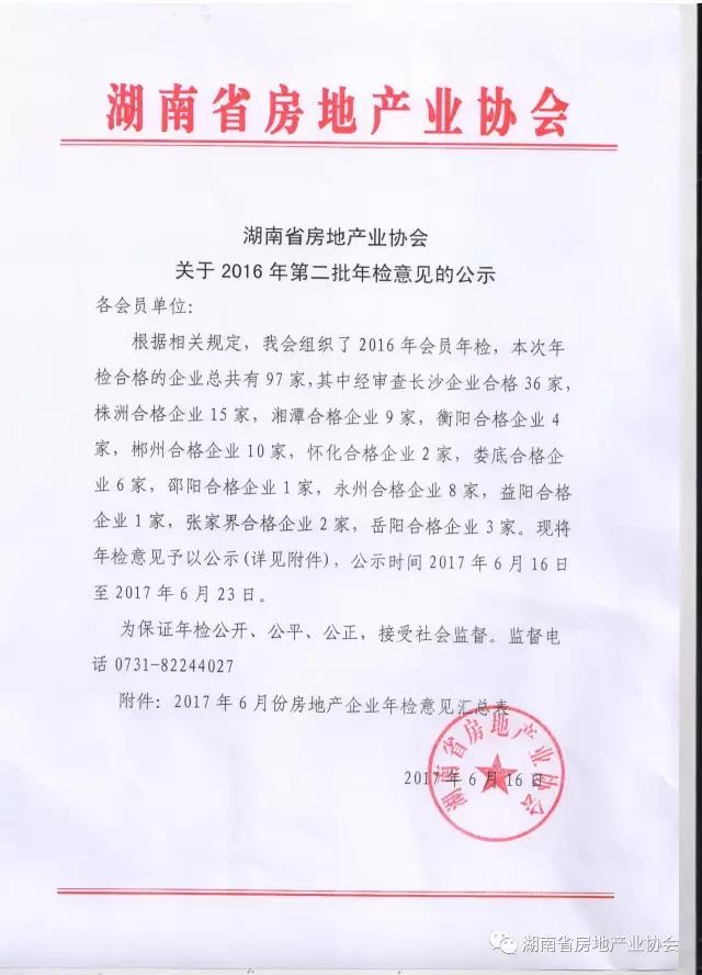 湖南省房地產(chǎn)業(yè)協(xié)會關(guān)于2016年第二批年檢意見的公示