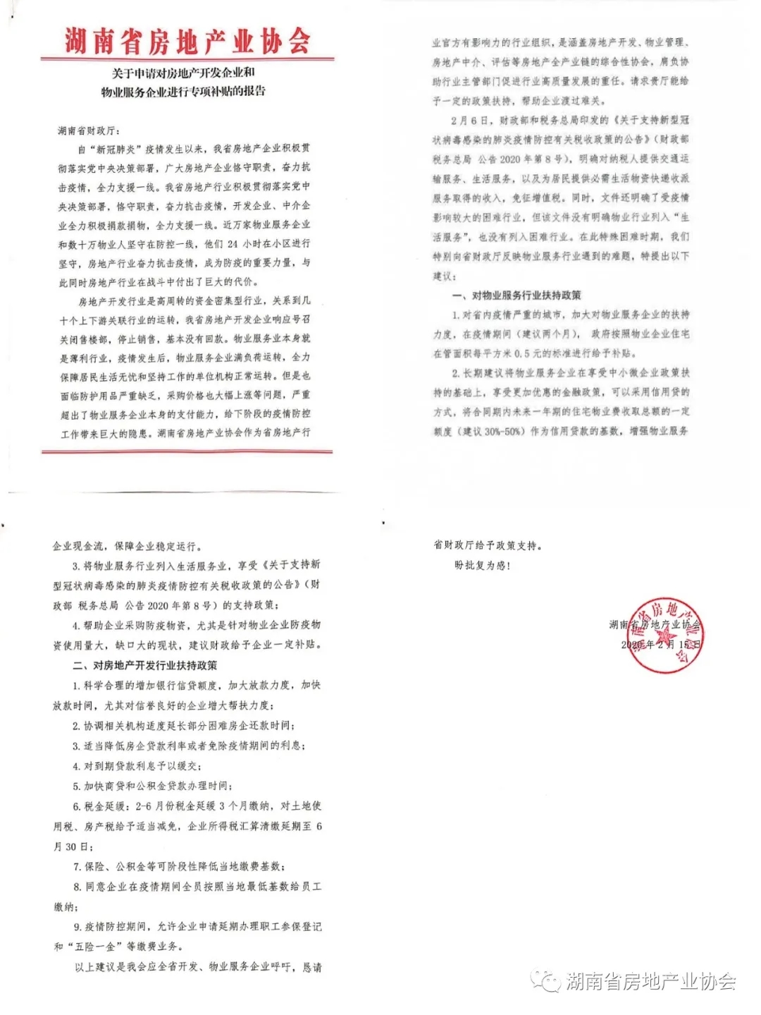 疫情過后行業如何迅速恢復生產,健康發展是省房協關切的重點。抗“疫”站打響以來,省房協一手推進抗疫防控,一手調研抗疫實情。據初步統計,疫情期間物業行業累計使用口罩近980萬個,84消毒液1151噸,酒精287.5噸,防疫物資和因“疫”而增加的人工成本高達1.5億元,為我省疫情防控工作做出了重要貢獻,卻也讓困難更為凸顯。針對因此而來的行業普遍困難,我會向湖南省財政廳、湖南省稅務局分別提交了《關于申請對房地產開發企業和物業服務企業進行專項補貼的報告》,為行業爭取扶持政策,渡過難關。報告得到了省住建廳領導的高度重視和幫助,順利提交。2月18日,國家稅務總局湖南省稅務局給予回復,表示會進一步重視并支持疫情期間物業服務行業和開發行業的減負工作,將部分我會提出的重點建議反饋至上級部門爭取政策支持。
