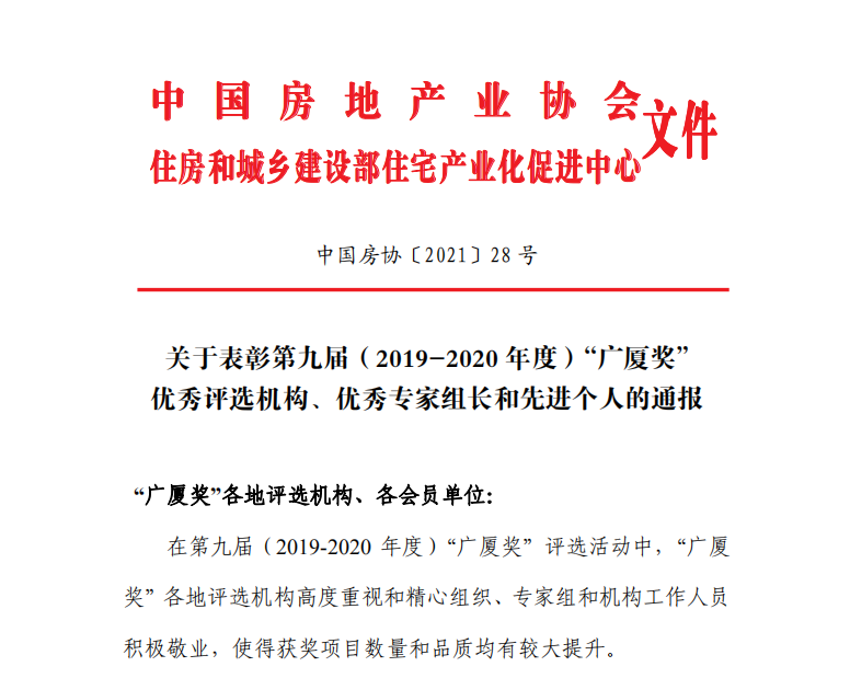 2021年3月16日,中國房地產(chǎn)業(yè)協(xié)會、住房和城鄉(xiāng)建設部住宅產(chǎn)業(yè)化促進中心發(fā)布了《關于表彰第九屆(2019-2020年度)“廣廈獎”優(yōu)秀評選機構、優(yōu)秀專家組長和先進個人的通報》。