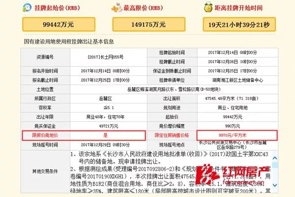 根據(jù)交易條件,該地塊最高限價(jià)為149175萬(wàn)元(折合樓面地價(jià)6152元/平方米),該宗住宅用地限定房屋銷售價(jià)為9970元/平方米(精裝修價(jià)格不計(jì)入房屋銷售價(jià),精裝修價(jià)格由住建委按規(guī)定確定,下同)。同時(shí),該宗地達(dá)到土地交易最高限價(jià)時(shí),則按《長(zhǎng)沙市住宅用地“限房?jī)r(jià)、競(jìng)地價(jià)”試點(diǎn)操作規(guī)則》和《長(zhǎng)沙市國(guó)土資源交易現(xiàn)場(chǎng)搖號(hào)操作實(shí)施細(xì)則》的規(guī)定進(jìn)行資格審查,資格審查合格的競(jìng)買人方可參與現(xiàn)場(chǎng)搖號(hào)。