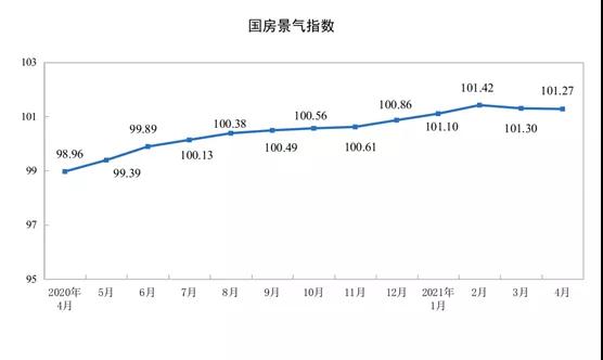 4月份,房地產(chǎn)開發(fā)景氣指數(shù)(簡稱“國房景氣指數(shù)”)為101.27。