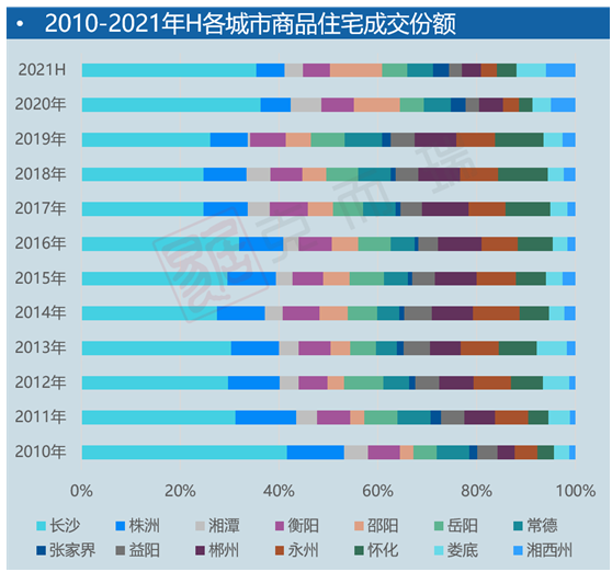 2021年湖南土地市場呈現低價高容的狀態,土地市場理性有序,樓面價穩步提升;城市端看,雙集中節點下熱度聚焦長沙,地州市相對冷清,房企也開始由地級市向長沙轉移。另一方面,長沙和地級市價差逐步拉大,合理價差促虹吸放緩,湘西南區域市場份額普漲。