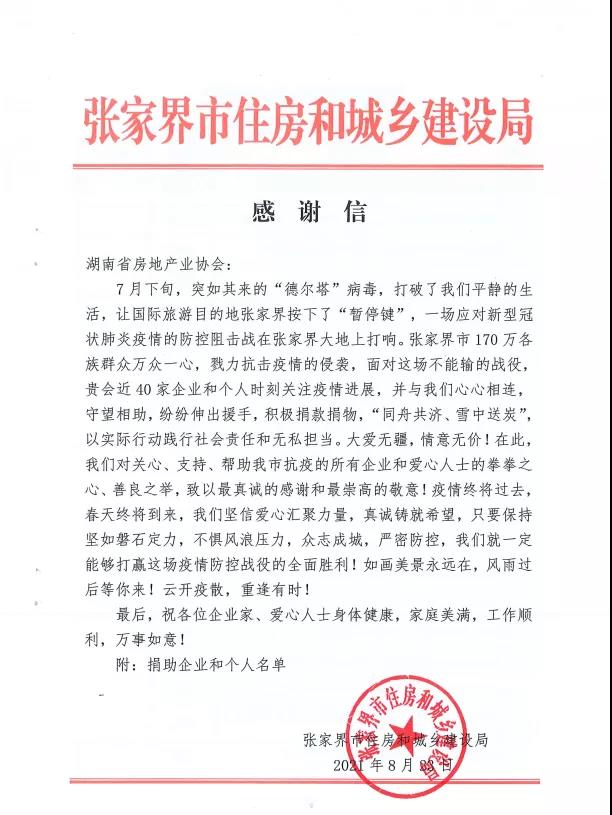 近日,為履行行業(yè)社會責(zé)任,我會組織近40家企業(yè)和個人進(jìn)行捐款,用于購買物資支援張家界疫情防控工作。為此,張家界市住房和城鄉(xiāng)建設(shè)局向我會發(fā)來了感謝信,信中對省房協(xié)和各愛心企業(yè)、愛心人士在張家界疫情防控中的無私擔(dān)當(dāng)表達(dá)了真摯的謝意。