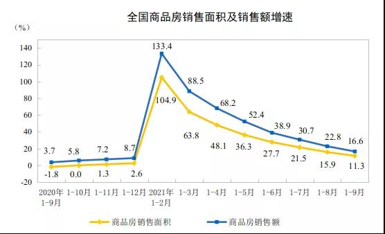 1—9月份,商品房銷售面積130332萬平方米,同比增長11.3%;比2019年1—9月份增長9.4%,兩年平均增長4.6%。其中,住宅銷售面積增長11.4%,辦公樓銷售面積增長3.1%,商業營業用房銷售面積增長0.7%。商品房銷售額134795億元,增長16.6%;比2019年1—9月份增長20.9%,兩年平均增長10.0%。其中,住宅銷售額增長17.8%,辦公樓銷售額增長0.5%,商業營業用房銷售額增長0.5%。