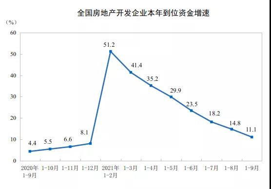 1—9月份,房地產開發企業到位資金151486億元,同比增長11.1%;比2019年1—9月份增長16.0%,兩年平均增長7.7%。其中,國內貸款18770億元,下降8.4%;利用外資59億元,下降36.9%;自籌資金47212億元,增長6.1%;定金及預收款56689億元,增長25.6%;個人按揭貸款24124億元,增長10.7%。