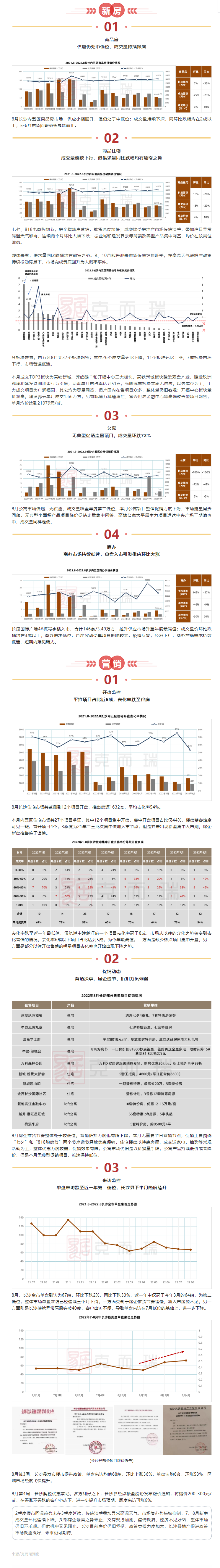 8月為樓市傳統淡季,市場延續7月低溫之勢,供應低位,成交持續下跌;長沙連續異常高溫天氣,客戶來訪進一步下降,整體開盤去化率跌至近一年最低值,各大樓盤去化率普遍低位,明星項目去化率也出現下降趨勢。