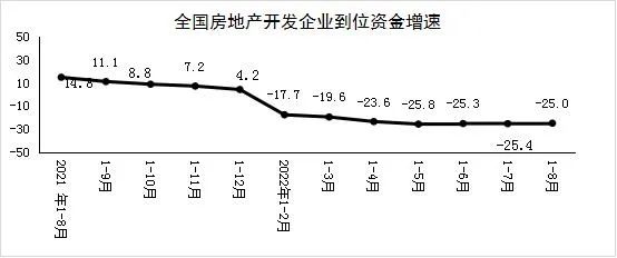 1—8月,全國房地產開發企業到位資金100817億元,同比下降25.0%。其中,國內貸款12280億元,下降27.4%;利用外資59億元,增長11.6%;自籌資金35771億元,下降12.3%;定金及預收款32719億元,下降35.8%;個人按揭貸款16243億元,下降24.4%。