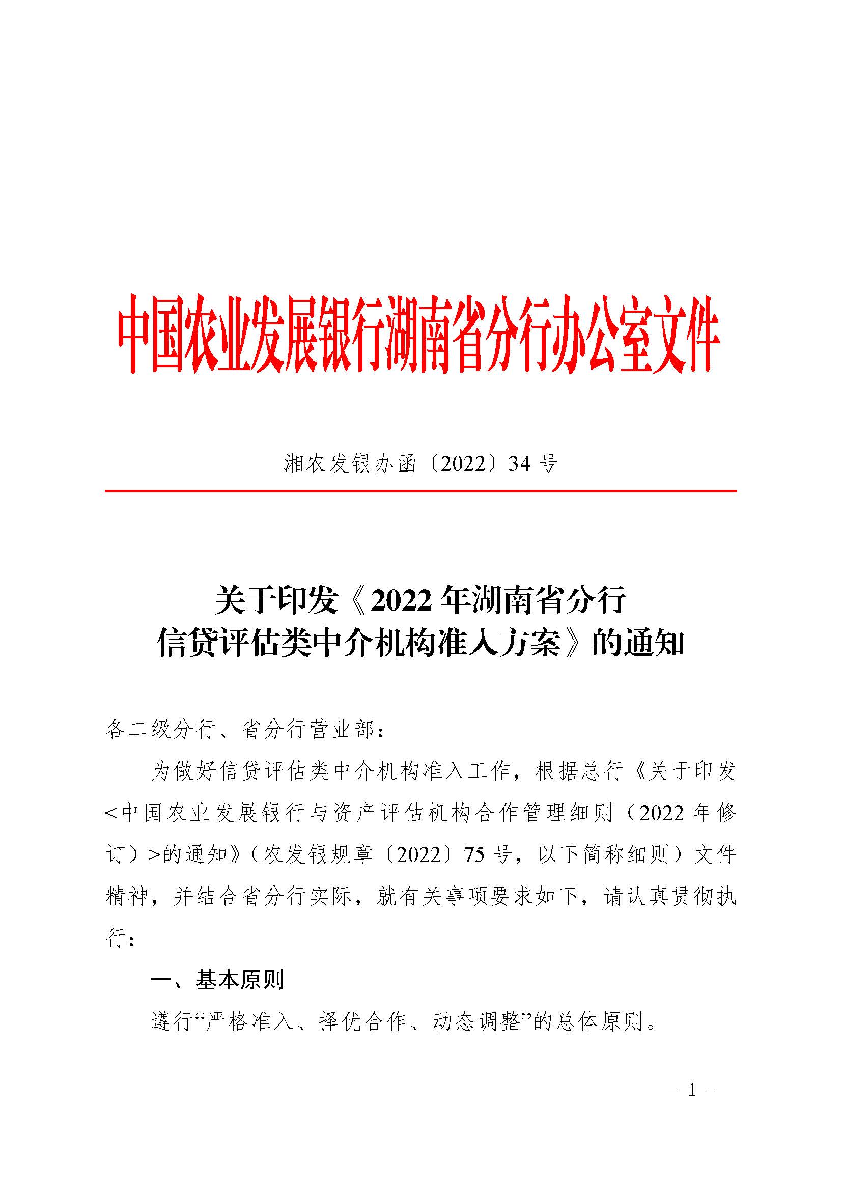 中國農業發展銀行湖南省分行關于印發《2022年湖南省分行信貸評估類中介機構準入方案》的通知