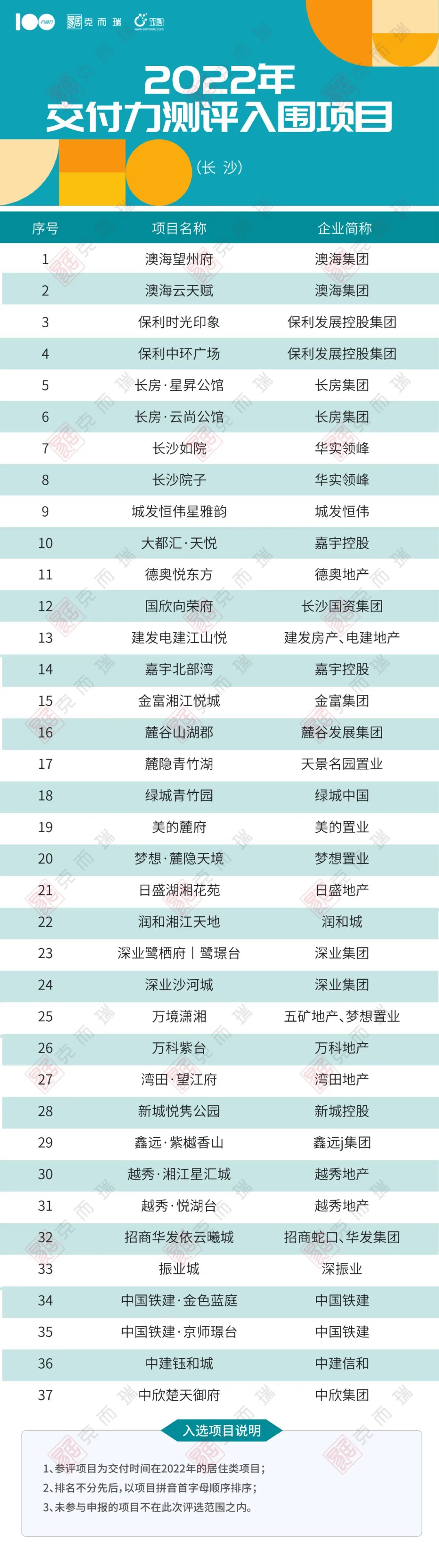 經過系列綜合測評,對150+細分指標的客觀數據進行初審打分,共計37個項目脫穎而出,入圍克而瑞“長沙2022年度交付力測評榜單”。