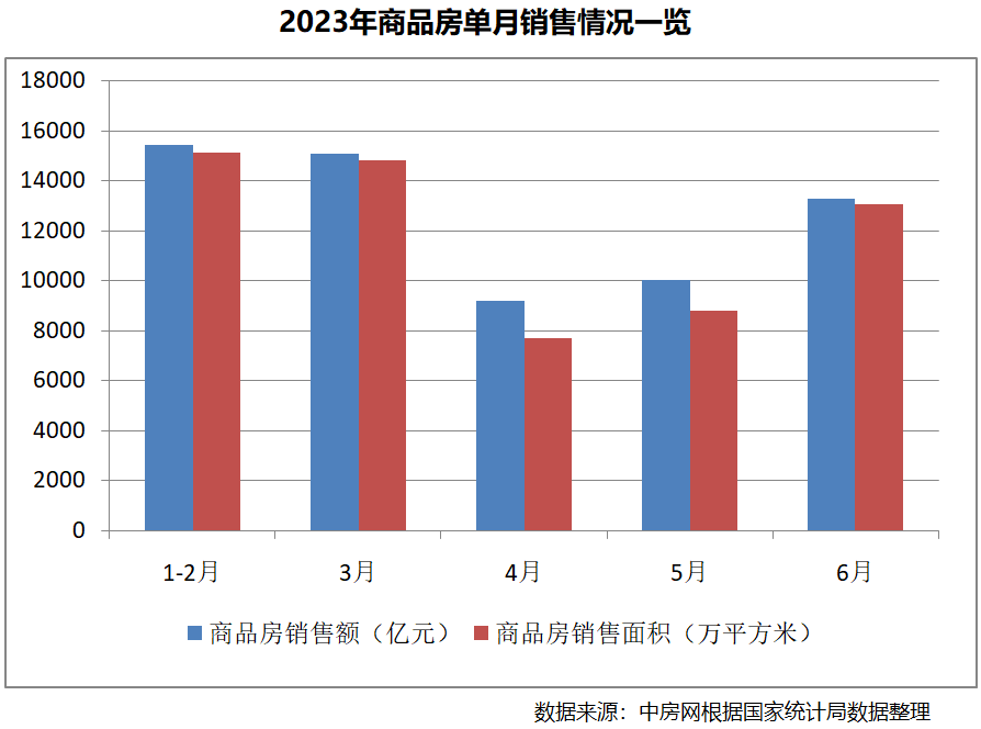 從單月銷售情況來看,根據國家統計局數據拆分后測算,6月份商品房銷售面積為13075萬平方米,環比上漲48.51%,同比下降28.10%。商品房銷售額13305億元,環比上漲32.56%,同比下降24.98%。