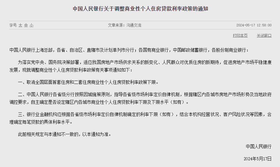 中國人民銀行上??偛浚魇?、自治區(qū)、直轄市及計劃單列市分行;各國有商業(yè)銀行,中國郵政儲蓄銀行,各股份制商業(yè)銀行:為落實黨中央、國務(wù)院決策部署,適應(yīng)我國房地產(chǎn)市場供求關(guān)系的新變化、人民群眾對優(yōu)質(zhì)住房的新期待,促進(jìn)房地產(chǎn)市場平穩(wěn)健康發(fā)展,現(xiàn)就調(diào)整商業(yè)性個人住房貸款利率政策有關(guān)事項通知如下:一、取消全國層面首套住房和二套住房商業(yè)性個人住房貸款利率政策下限。