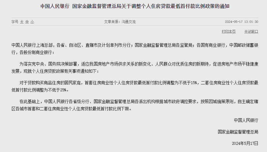中國人民銀行 國家金融監(jiān)督管理總局關(guān)于調(diào)整個人住房貸款最低首付款比例政策的通知
