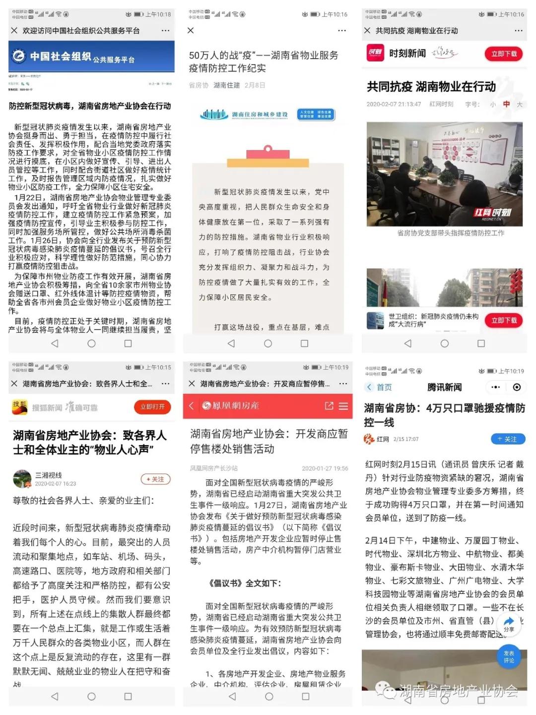 5.組織省內(nèi)外媒體為行業(yè)抗疫宣傳鼓勁。我會聯(lián)系民政部國家社會組織管理局官網(wǎng)中國社會組織公共服務平臺、中國建設報、中國物業(yè)管理協(xié)會官網(wǎng)和公眾號、省住建廳官網(wǎng)和公眾號新華網(wǎng)、搜狐網(wǎng)、湖南日報、新湖南、紅網(wǎng)、新浪樂居、瀟湘晨報等10多家國家、省級媒體宣傳報道行業(yè)抗疫新聞,積極有力的引導全行業(yè)的防控工作。協(xié)會開設全省防疫工作專題網(wǎng)頁,聯(lián)系省內(nèi)外新聞媒體做好行業(yè)疫情宣傳。