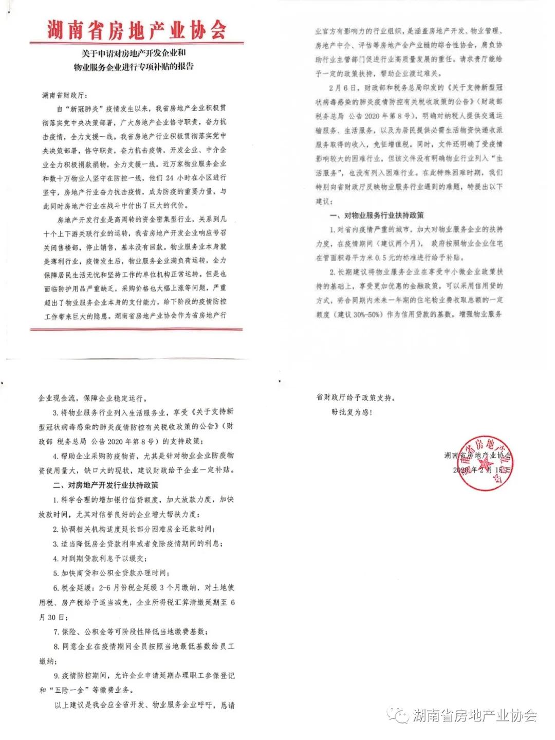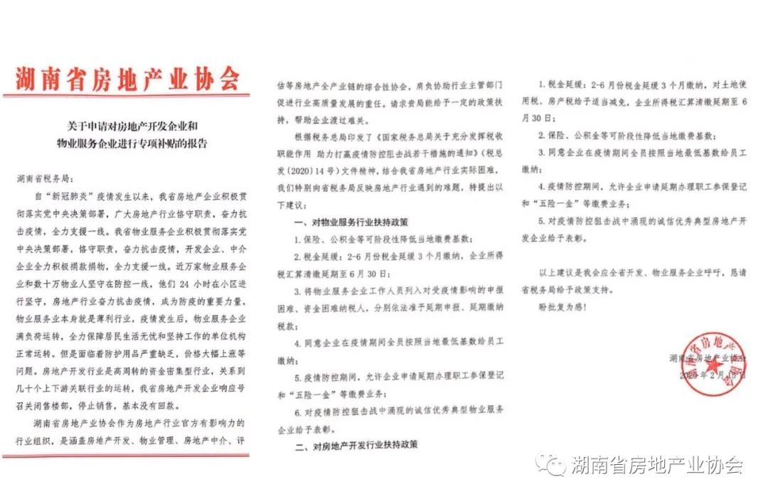疫情過后行業(yè)如何迅速恢復生產(chǎn),健康發(fā)展是省房協(xié)關切的重點。針對開發(fā)、物業(yè)、中介、評估行業(yè)普遍存在的困難,我會向湖南省財政廳、湖南省稅務局分別提交了《關于申請對房地產(chǎn)開發(fā)企業(yè)和物業(yè)服務企業(yè)進行專項補貼的報告》,為行業(yè)爭取扶持政策,幫助企業(yè)渡過難關。省住建廳領導非常重視,廳領導親自指導并過問“報告”起草工作,省住建廳房產(chǎn)處也積極與省財政廳、省稅務局、省發(fā)改委等相關部門多次對接積極爭取政策幫助。在廣泛調(diào)研后,我會擬定的“政策建議報告”現(xiàn)已分別上報省財政廳、省稅務局。國家稅務總局湖南省稅務局在認真研究我會的政策建議報告,于2月18日針對建議逐一給予了回復,并表示會進一步重視并支持疫情期間物業(yè)服務行業(yè)和開發(fā)行業(yè)的減負工作,尤其將部分我會提出的重點建議條款反饋至上級部門爭取能得到政策支持。