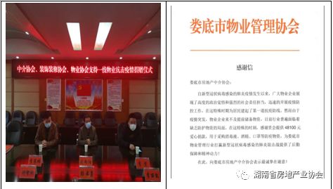 左圖:愛心捐贈儀式現場 右圖:婁底市物業管理協會感謝信