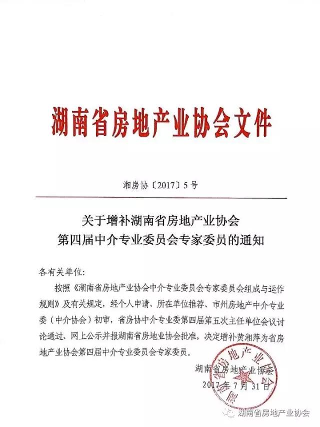 關(guān)于增補(bǔ)湖南省房地產(chǎn)業(yè)協(xié)會(huì)第四屆中介專業(yè)委員會(huì)專家委員的通知