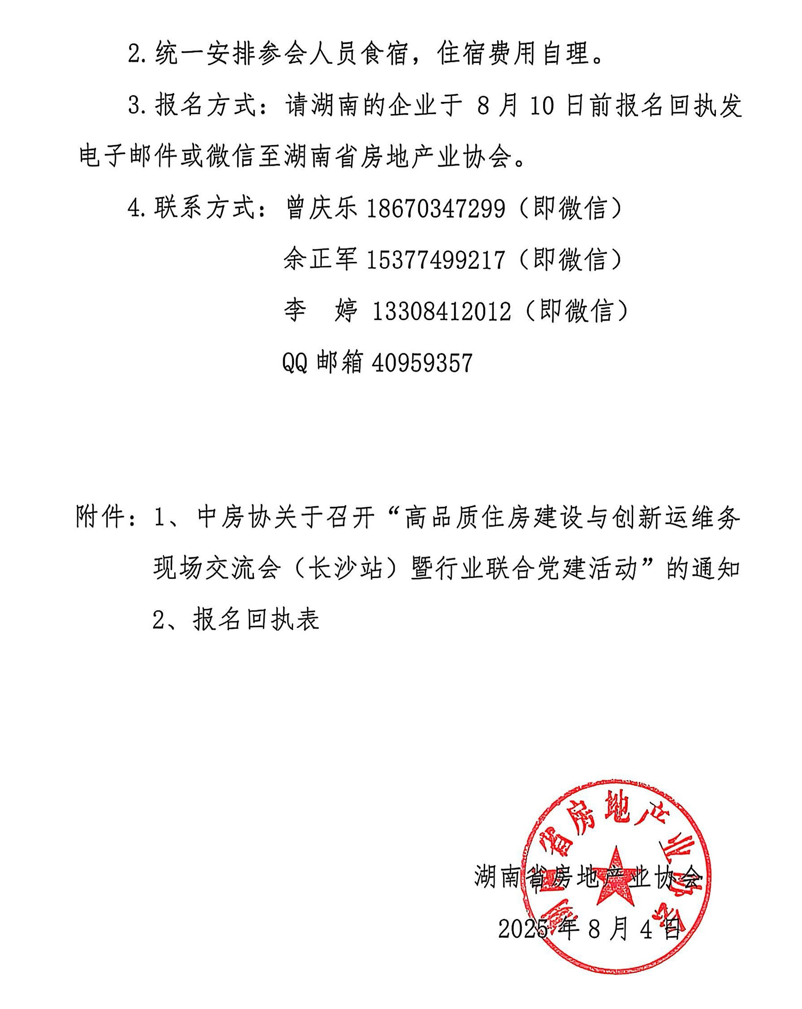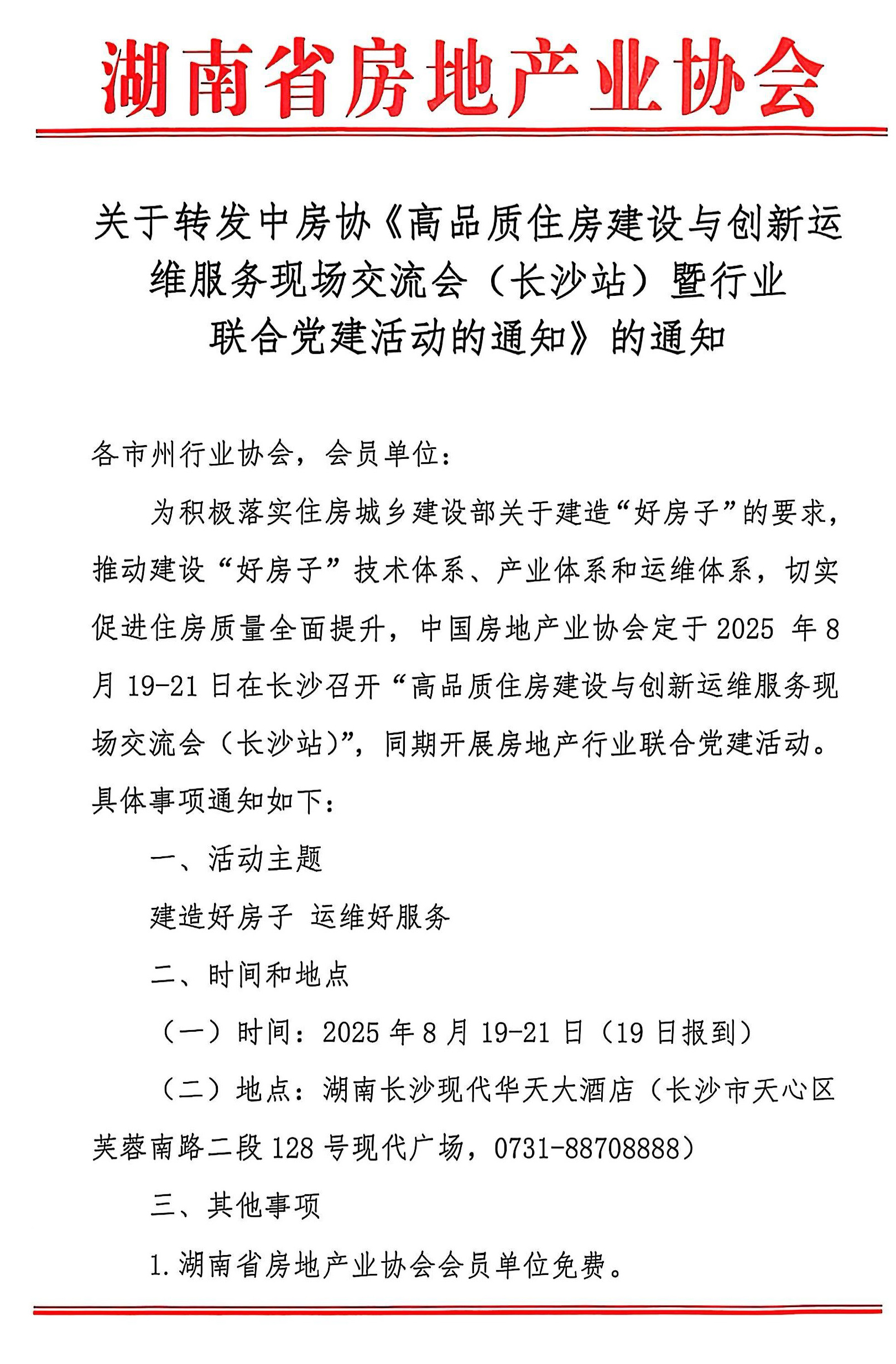 附件:1、中房協關于召開“高品質住房建設與創新運維務現場交流會(長沙站)暨行業聯合黨建活動”的通知(點擊下載)