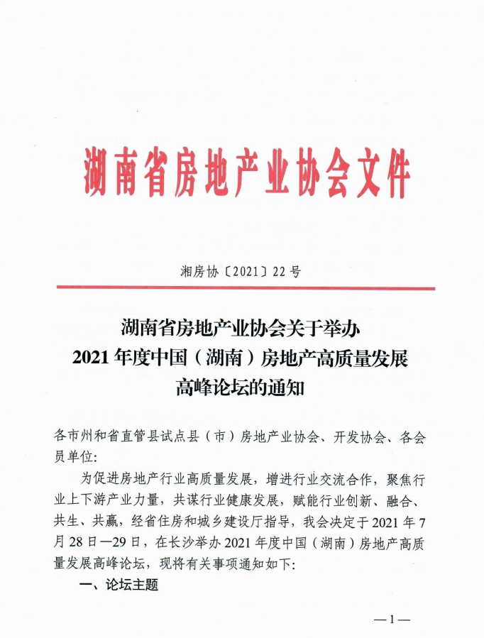 關于舉辦 2021年度湖南省房地產高質量發展高峰論壇的通知