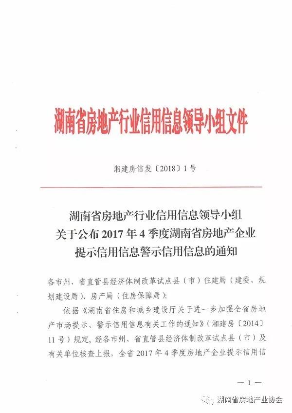 湖南省房地產行業信用信息領導小組關于公布2017年4季度湖南省房地產企業提示信用信息警示信用信息的通知