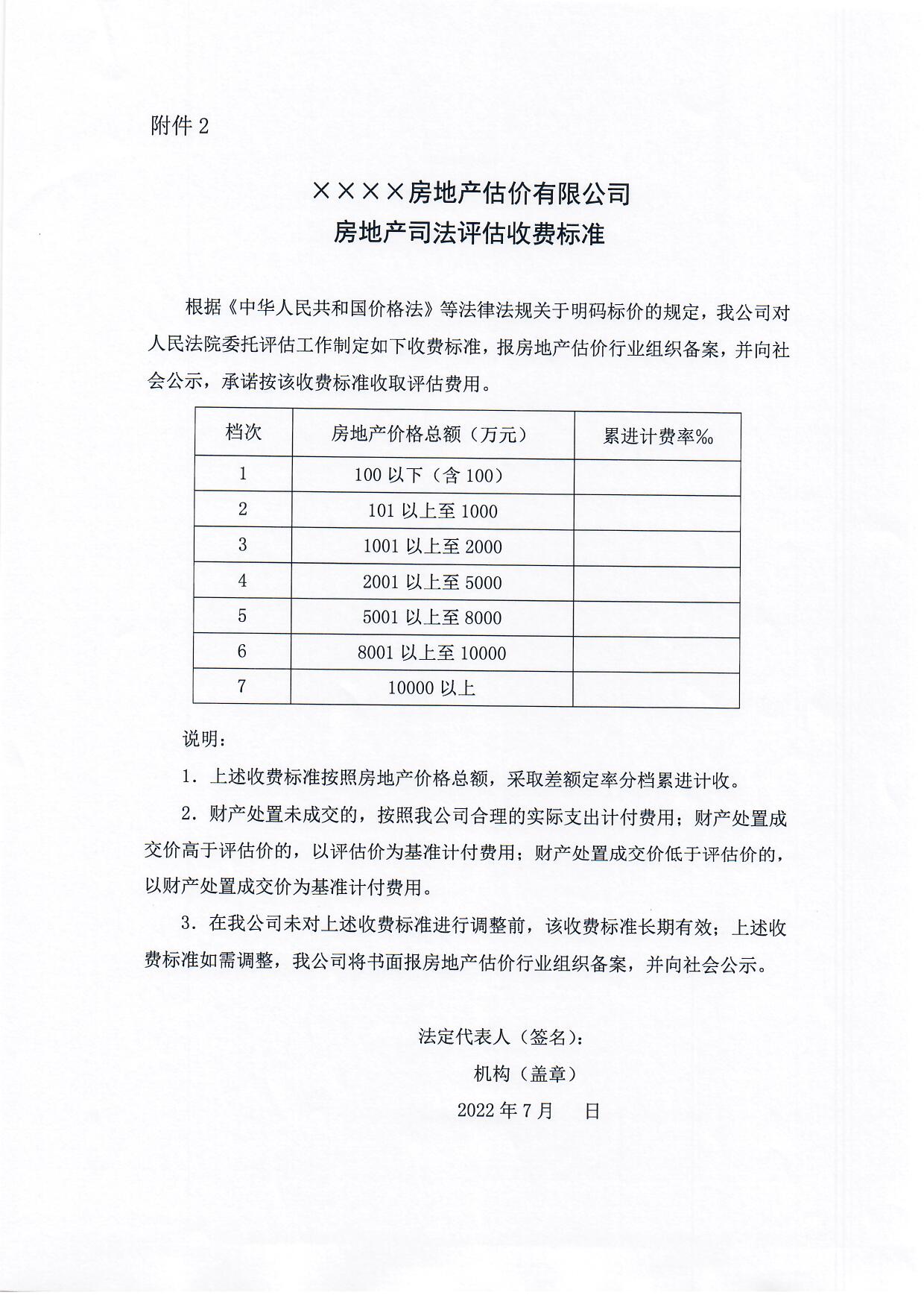 2.房地產(chǎn)司法評估收費(fèi)標(biāo)準(zhǔn)(附件2)。