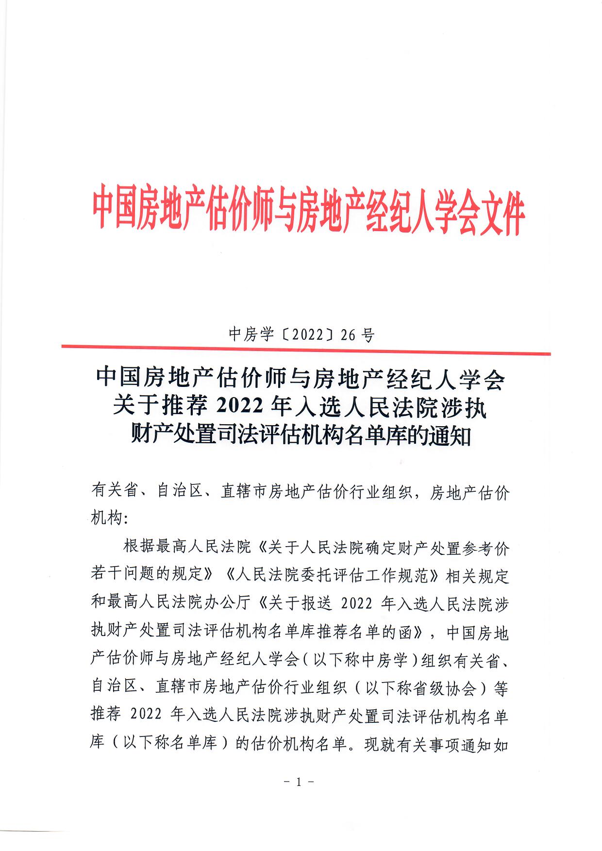 轉(zhuǎn)發(fā)中房學(xué)《關(guān)于推薦2022年入選人民法院涉執(zhí)財(cái)產(chǎn)處置司法評估機(jī)構(gòu)名單庫的通知》