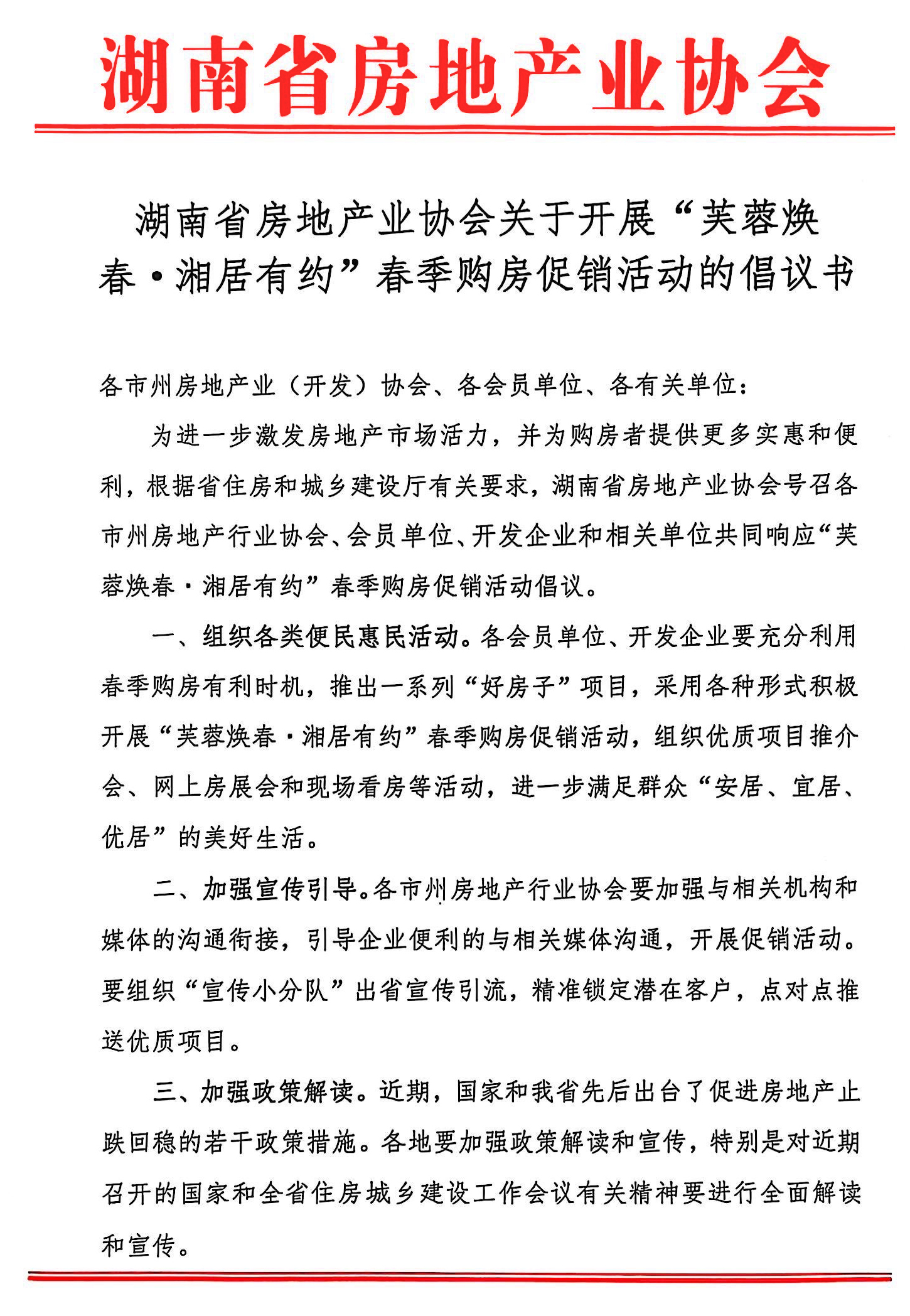 關于開展“芙蓉煥春·湘居有約”春季購房促銷活動的倡議書